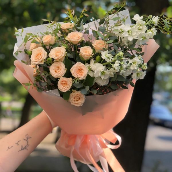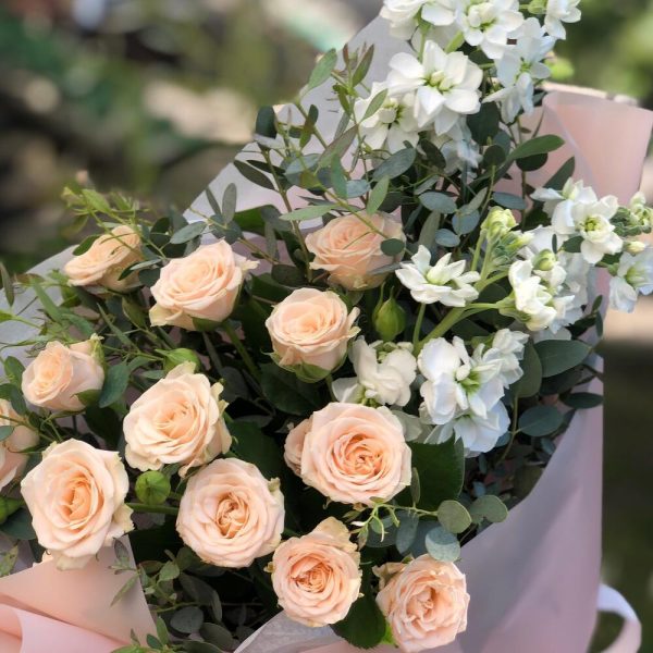 Летний, нежный, воздушный и свежий букет из белых маттиол и кремовой нежной кустовой розы. Мелкая листва эвкалипта прекрасно дополняет роскошные цветы и добавляет им зелёной свежести. Необычный светло персиковый букет для тех, кому нравятся нежные букетики из полевых цветов.
