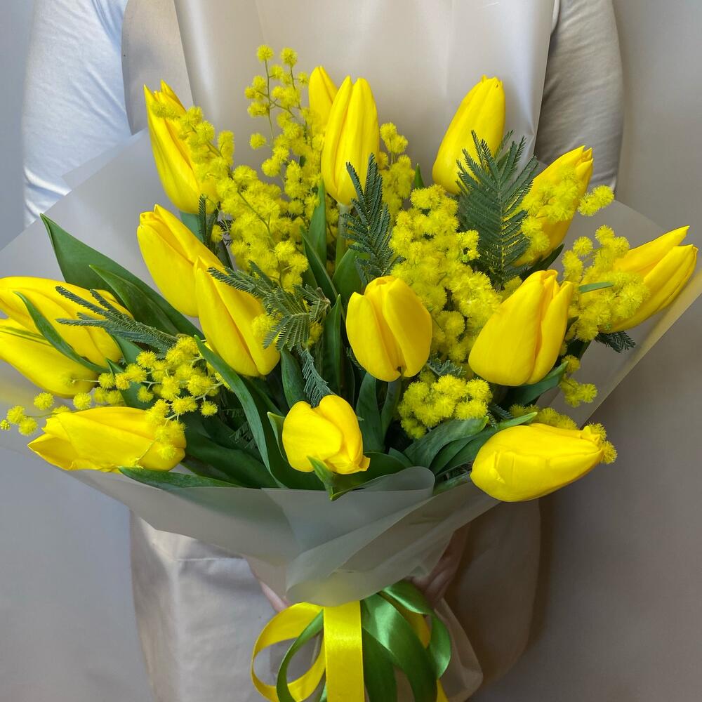 Букет из 15 жёлтых Тюльпанов и мимозы в Ишимбае